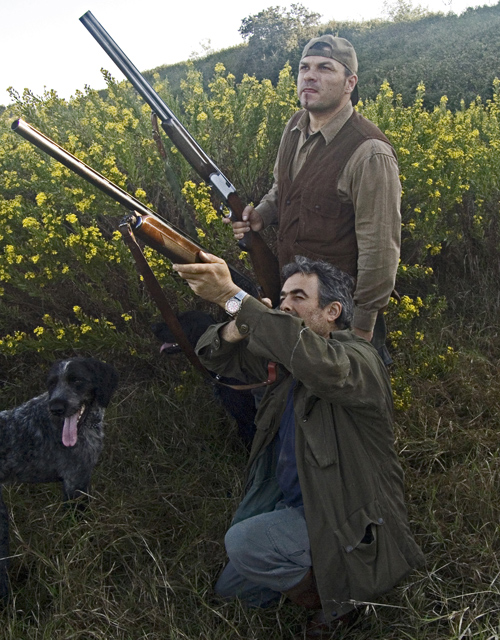 Visto che si tratta di una foto di caccia, mi sarei aspettato una foto con il cane in posa (testa alta e coda tesa) in attesa del consenso del cacciatore, in genere sul cane ci sta un solo cacciatore (il cane altrimenti non sa da chi deve avere il consenso).