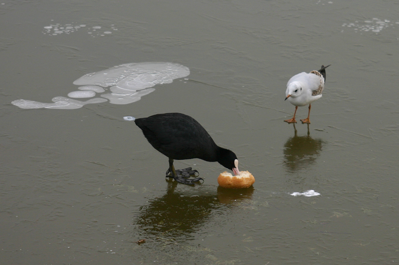 ehi tu uccello dalle buffe zampe, guarda che dopo tua sorella toccava a me mangiare, disse il giovane gabbiano. -- Eh-eh provaci allora giovane presuntuoso, rispose la folaga cominciando a gustare il pezzo di pane.....