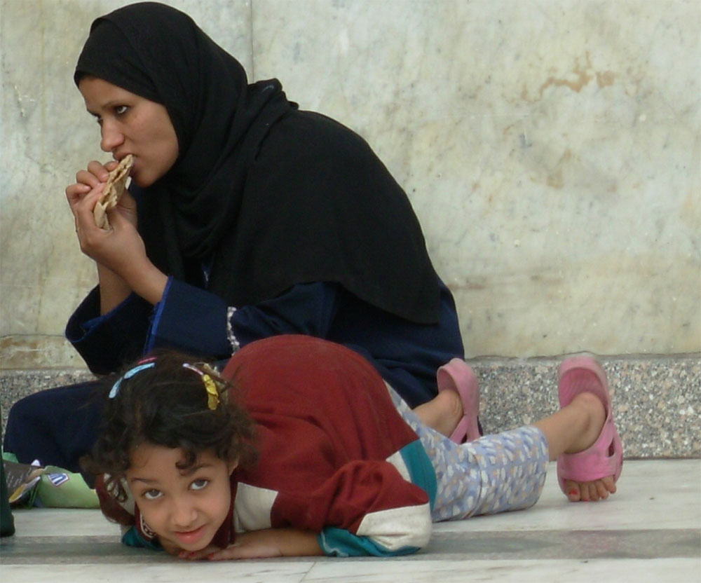 notevole il contrasto, da te richiamato nel titolo, di madre e figlia (suppongo): da un lato la madre, con lo sguardo duro (e rivolto chissà verso chi) dato da una vita assai dura mangia quel poco di cibo che è riuscita a raccogliere, dall'altro la bambina, che anche nell'abbigliamento molto colorato si contrappone a sua madre, assume una posizione e uno sguardo molto più "vivo"...