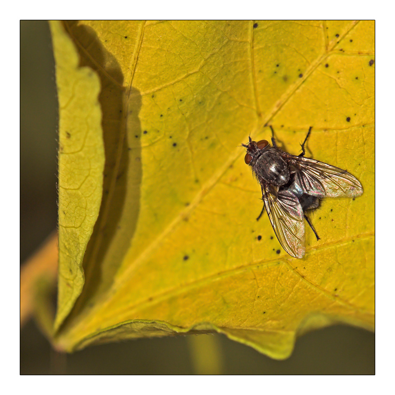 Anzi... la composizione è assolutamente bella con una geometria impeccabile con la diagonale perfettamente tracciata dalla venatura della foglia scartocciata e la posizione della mosca che ispira un piacevole rincorrersi di triangoli e triangolini.