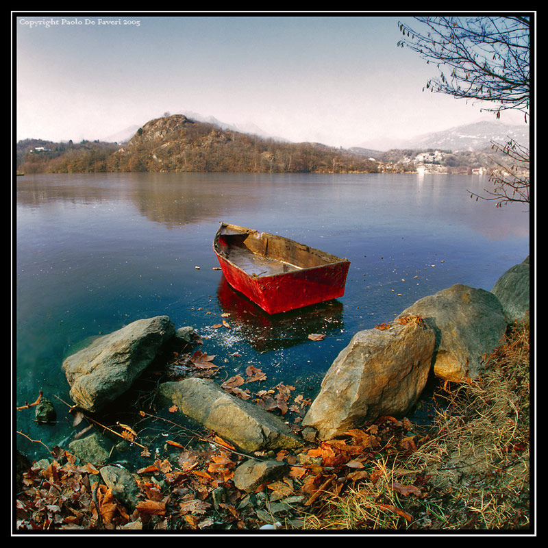 X Greggz e Gianluca: la barca al centro e la presenza dei rametti a destra sono due aspetti della composizione legati uno all'altro. Quel giorno avevo solo il fisheye come grandangolo, e volendo inquadrare una buona porzione di primissimo piano con quelle belle foglie gialle a far da contrasto alle roccie, il punto di ripresa è risultato praticamente obbligato. Un po' più a destra, e l'inquadratura si sarebbe riempita dell'alberello che avrebbe messo in secondo piano qualunque altra cosa; un po' più a destra e il primo piano sarebbe diventato un bel cestone dell'immondizia! |