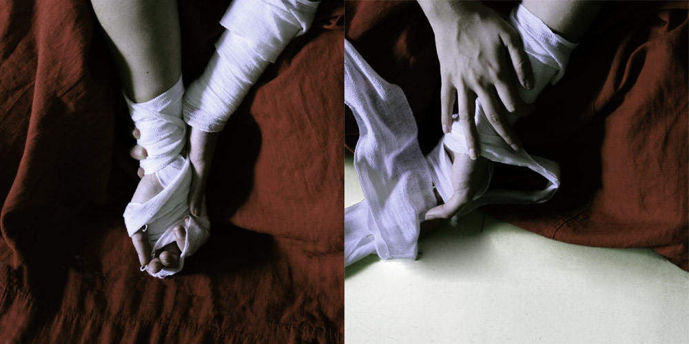 La prima delle due mi piace così com'è, da sola, per i colori (bello il rosso mattone che ricorda il colore del sangue), la posizione delle mani e l'equilibrio che ne risulta.