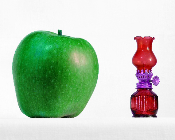 Per quanto riguarda i colori in effetti il rosso e il verde sono complementari ... ma il colore dei due oggetti non forma un contrasto reciproco così evidente, forse a causa del rosso che non è così puro e saturo ma è costituito da diverse tonalità (solo la base del lumino è del rosso potente).