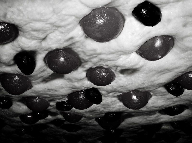 la fantasia di morgan è una cosa finta..! ihihihi! comuqnue sì, ciliegini e olive nere ma non su mozzarella...sulla base cruda, ancora! tutto quel bianco è la pasta, non mozzarella!
