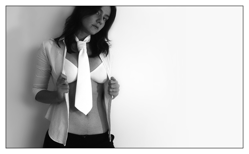 Guarda le cose che più mi piacciono di questo scatto (oltre alla modella ovviamente) sono il taglio, anche quello della testa e la cravatta che è l'elemento caratterizzante dell'immagine, rimango dubbioso sul reggiseno sia come modello sia come presenza, forse non indispensabile che senza cadere nel volgare si potrebbe sostituire con una camicetta più chiusa.