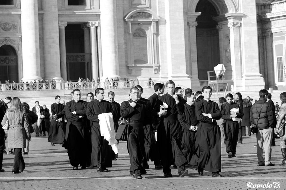 Io vedo questi preti che si allontanano dal Vaticano, ognuno di loro è solo, non parla con gli altri. Osservate i loro visi, quello del colletto è imbarazzato, uno sembra molto serio, altri due hanno lo sguardo assente, uno accenna ad un sorriso.. non so a me questo da l'idea della solitudine dell'uomo.