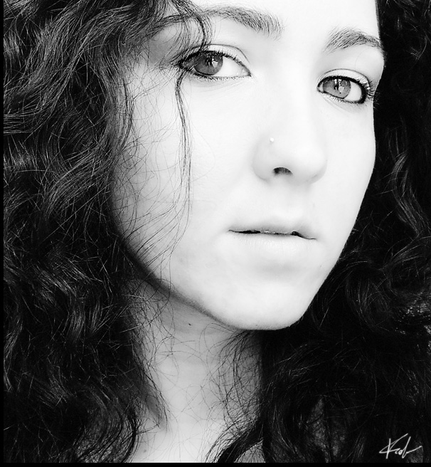 una foto glaciale. Avrei lasciato un filino di spazio sopra, ma proprio un filino. Il taglio mi piace, l'espressione e l'ombra sotto la mandibola belli. Sicuramente begli occhi. Sembra un viso di porcellana, come le donne giapponesi. Un po' inquieta l'espressione della bocca. per me è Ok!