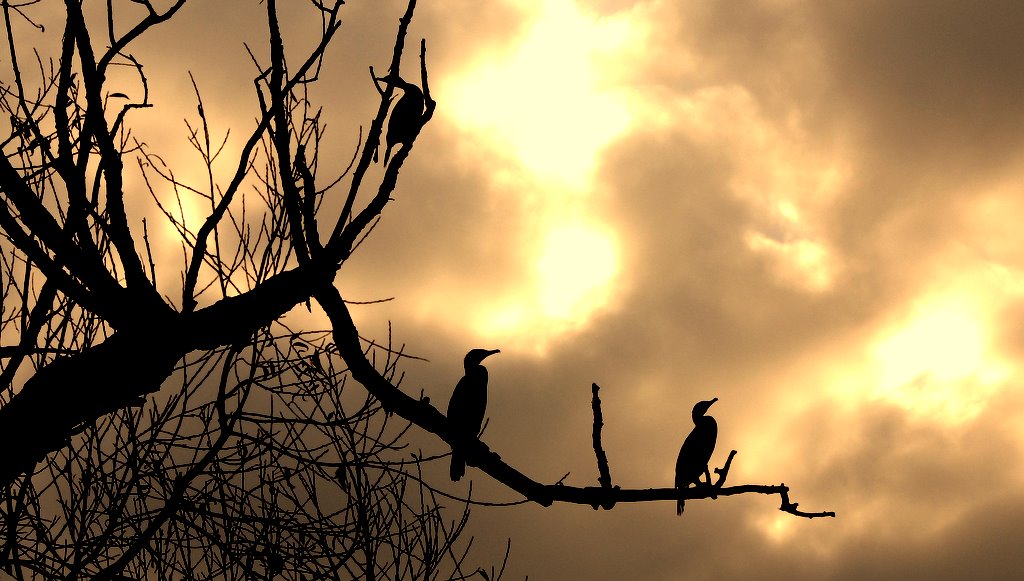 Cormorani a Torino in prima fila per assistere al tramonto.