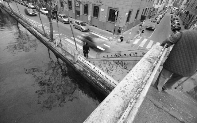 In effetti hai ragione, ma sinceramente quello che mi ha spinto a fotografare sono gli elementi che tu hai notato; da una parte una situazione "tranquilla": un uomo a passo lento, il Naviglio con i riflessi, dall'altra la frenesia classica della città: un uomo che sta per attraversare, una macchina che passa velocemente (sulle strisce pedonali) e il caos urbano. Il tutto diviso in due parti da una diagonale; mi piaceva l'idea e ho scattato. Probabilmente, come spesso mi accede, ho inserito troppi elementi.