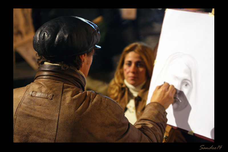 Cavolo, hai avuto buon occhio ma ti sei perso nel classico "bicchier d'acqua" accidenti! Bella occasione, ottima luce (vedere i colori caldi e quel filo di luce blu sul cappello e sulla spalla del pittore) ma la messa a fuoco doveva essere sulla "modella" che è la protagonista della scena e non sulle spalle del pittore.. sigh! |