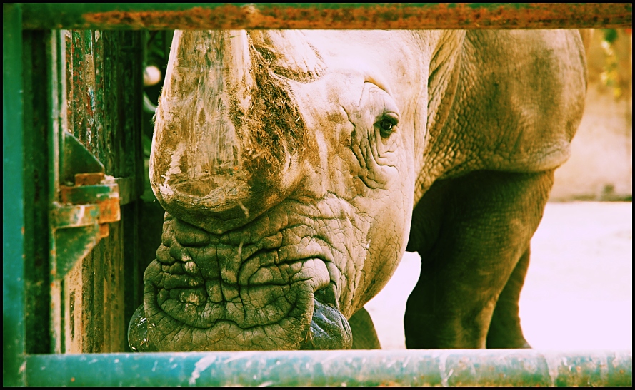 la foto presenta delle bruciature, eppure in questo caso non danno nessun fastidio (almeno per me), forse anche per l'uso particolare che fai del colore, e in un certo senso aiutano lo sguardo a posarsi subito sull'occhio espressivo del rinoceronte. Il fatto di aver ripreso anche la gabbia non solo incornicia lo scatto, ma permette di rafforzare il messaggio della foto. auauau (mio saluto da topo a te e al rinoceronte triste Triste )