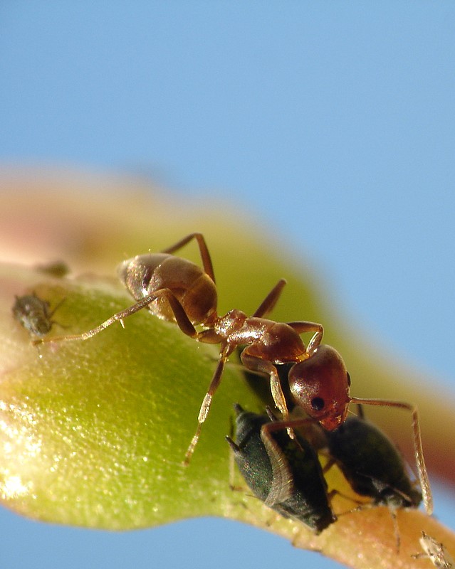 Una formica stimola (menandoli con le antenne) gli afidi a darsi da fare; non ditemi che sono diventato mono-maniaco: con questa smetto di fare il formichiere.