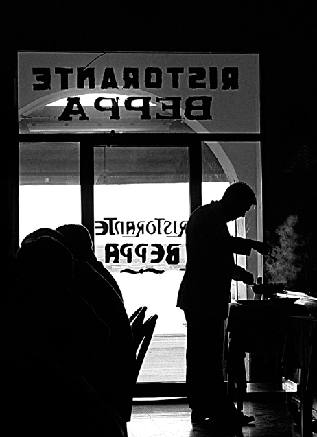 Un bn estremo, con quel poco di luce che serve a disegnare le persone a sx, che mi piace molto. Le lettere dell'insegna "scorticate" che a me mettono un po' di tristezza...come a sottolineare che la "beppa" ha visto giorni migliori.