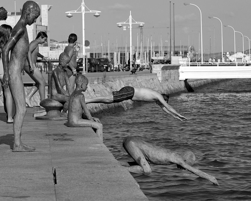 | Questa dal mio punto di vista è la tua migliore street. Finalmente ci offri un'inquadratura abbastanza ampia ed un bel gioco tra scenario ed esseri umani. Azzeccato il parallelismo tra il tuffatore e la statua in basso a destra, ottimo colpo d'occhio. Il B&N forse andrebbe ancora più contrastato, un po' sacrificata nell'inquadratura la statua a sinistra. Tra le due versioni preferisco quella in B&N che confonde lo spettatore come è giusto che sia.