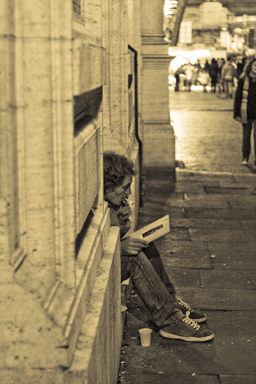Tuttavia, il punto di ripresa sembra più dettato dall'esigenza di non farsi notare dalla persona seduta che frutto di una scelta compositiva precisa. Difatti anche lo sfondo, che si apre parzialmente sulla destra, sembra inserito nell'inquadratura in maniera incerta. Credo dovesse essere o inserito con più decisione, ambientando la persona in primo piano, oppure essere escluso del tutto.