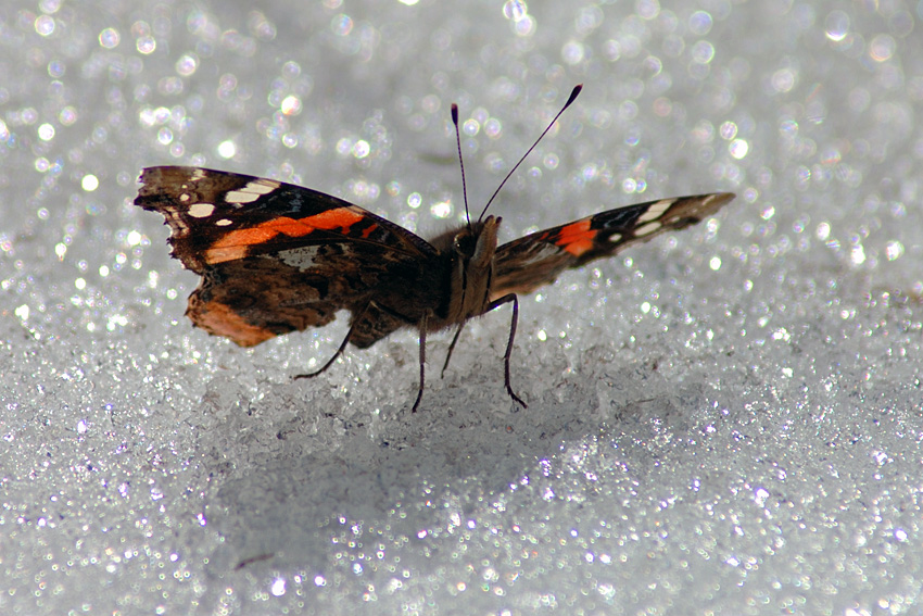 Bello il contrasto fra i colori della farfalla e il bianco della neve.