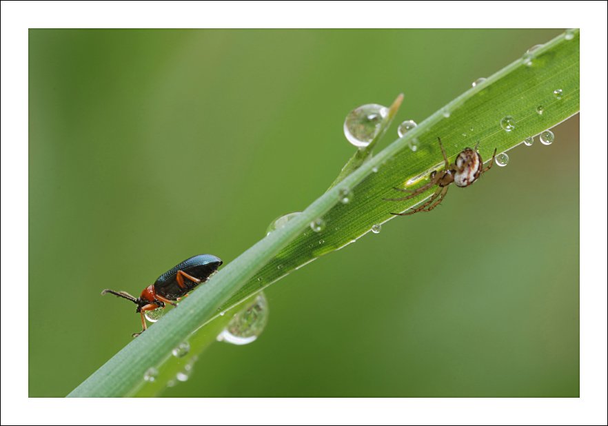 L'insetto "preda" ha la goccia al naso. Il predatore sembra che guardi attraverso il foro nella foglia.