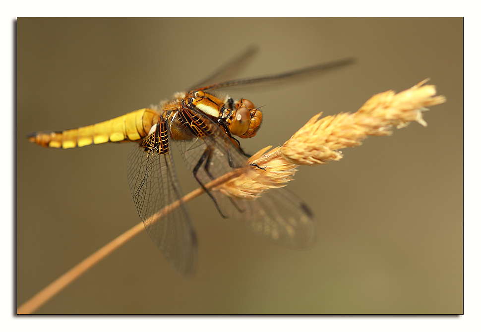Lo stelo della spiga si inclina sotto il "peso" dell'insetto in un lievissimo arco e definisce la diagonale principale mentre le ali ripiegate in avanti mosse e sfocate, suggeriscono un movimento rapido e leggero.