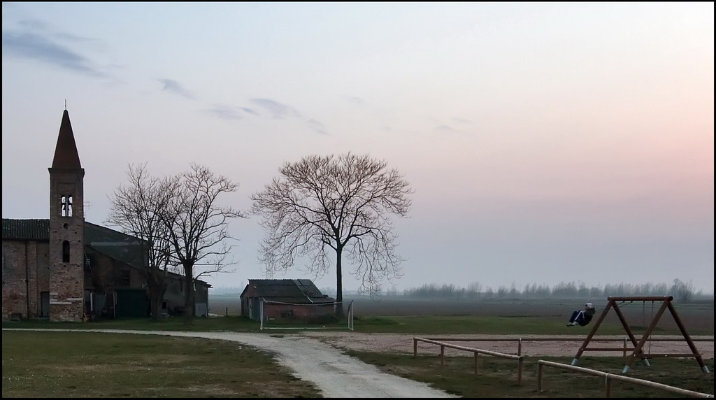 Mi unisco ai complimenti è un'immagine che non ci si stanca a guardare e riguardare. Senza tempo ogni elemento contribuisce a creare un'atmosfera di pace e quiete; bello il taglio e belli tutti gli elementi il bambino che da una marcia in più alla foto, la nebbia sullo sfondo che restituisce un pò di incanto, la pieve con la sua pace e il senso del tempo che fu.. Bravo Ok!