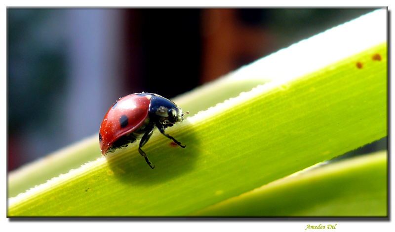 si è un po' sovraesposta però la composizione mi piace molto! Con quelle due zampette che si arrampicano faticosamente verso la meta...Simpatica!