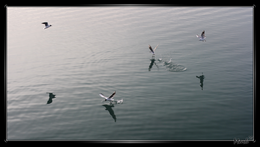 Mi piace il gioco dei gabbiani e le loro ombre cosi come gli zampilli d'acqua e il cerchio di onde concentriche sul lato destro..