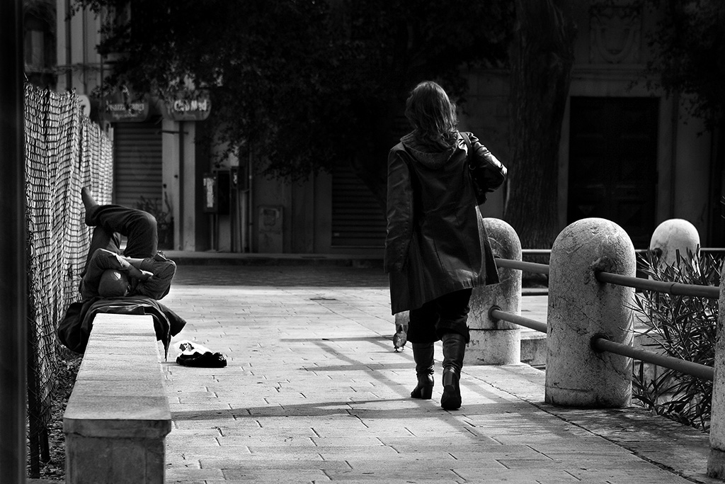 Una bella luce coadiuvata da un bianco e nero molto buono; una composizione gradevole priva di particolari elementi di disturbo, grazie anche allo sfondo in ombra; due soggetti non privi di interesse, l'uomo in comoda posizione da relax e la donna che se ne va di spalle, con passo sicuro. Certo, manca il cosiddetto 'attimo irripetibile' che le darebbe una marcia in più, ma, a mio avviso, resta un esercizio ben riuscito di street