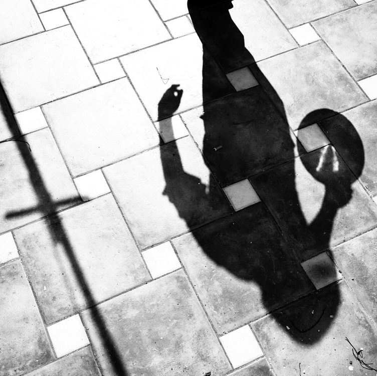 In questo caso il titolo (piuttosto cervellotico), parrebbe volerci suggerire un'analogia tra la forma dell'ombra e la figura del Cristo in croce, con la croce rappresentata dall'altra ombra sulla sx. Ora, anche considerando che le braccia dell'ombra non sarebbero in posizione propriamente 'canonica', guidati dal titolo qualche somiglianza si può in effetti trovare (la posizione delle gambe, la testa che sembra reclinata sul busto). Ma preferisco non spingermi oltre, non per la natura dell'argomento, ma perchè, come osservatore della fotografia, non voglio 'stare al gioco' del titolo ed accettare a priori la visione da esso imposta.