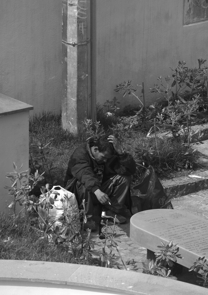 Il personaggio e la sua posa incutono grande tristezza, quindi la foto "comunica". Però il bn è troppo grigio, manca di contrasti. Inoltre ritengo che la composizione poteva essere migliorata ponendo il soggetto più decentrato verso sx, eliminando qualche elemento di disturbo che non aggiunge nulla alla descrizione dell'ambiente. (Parere personale, naturalmente).