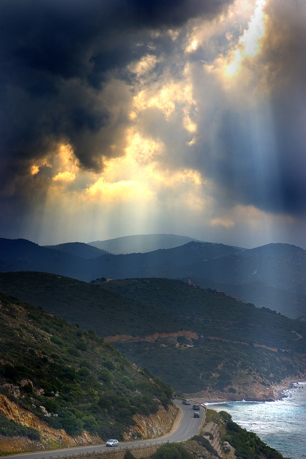 Le onde alternate delle colline fino ai monti danno una bella profondità alla foto, creano un buon punto di fuga allo sguardo fino ai raggi. Ed è già un ottima foto! Ok!
