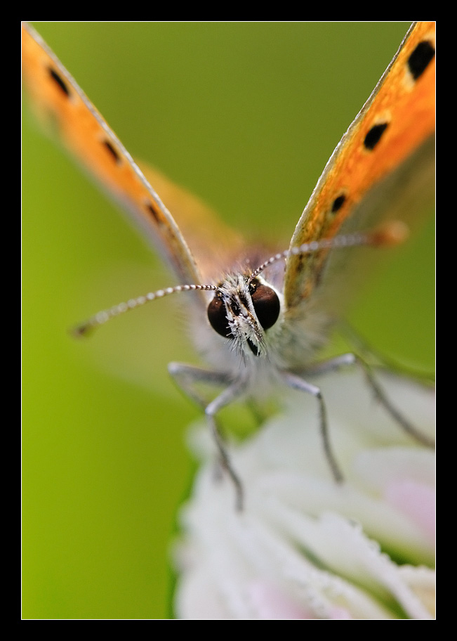 Mi piace molto la composizione, con quei nitidi occhioni ammalianti proprio al centro del fotograqmma e il raffinato rimando geometrico tra l'ampia V delle ali e il batuffolo in basso, che sembrano bilanciarsi e completarsi alla perfezione