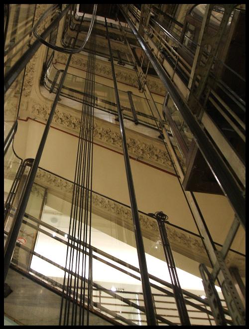 Mi piace l'accostamento tra cavazzi vari e le scale signorili, ma non sono convinto al 100% della composizione: la parte luminosa in basso ferisce un po' l'occhio e forse avresi sfruttato di piu' la diagonale facendo partire i cavi dall'angolo in basso a sx per farli arrivare in alto a dx, includendo un po' di piu' la parte scura in alto (nn so se e' il fondo dell'ascensore o il vano motore ) che avrebbe completato la fuga e compensato un po' la parte chiara gia' citata.