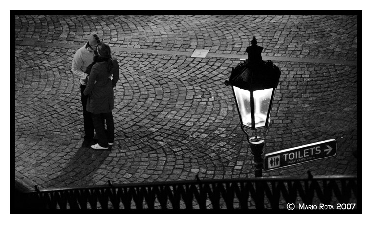 All'interno del romantico canovaccio del bacio degli innamorati ho voluto introdurre un elemento di disturbo (il cartello toilets) con i due personaggini che fa decisamente a pugni con il concetto idilliaco della coppietta.