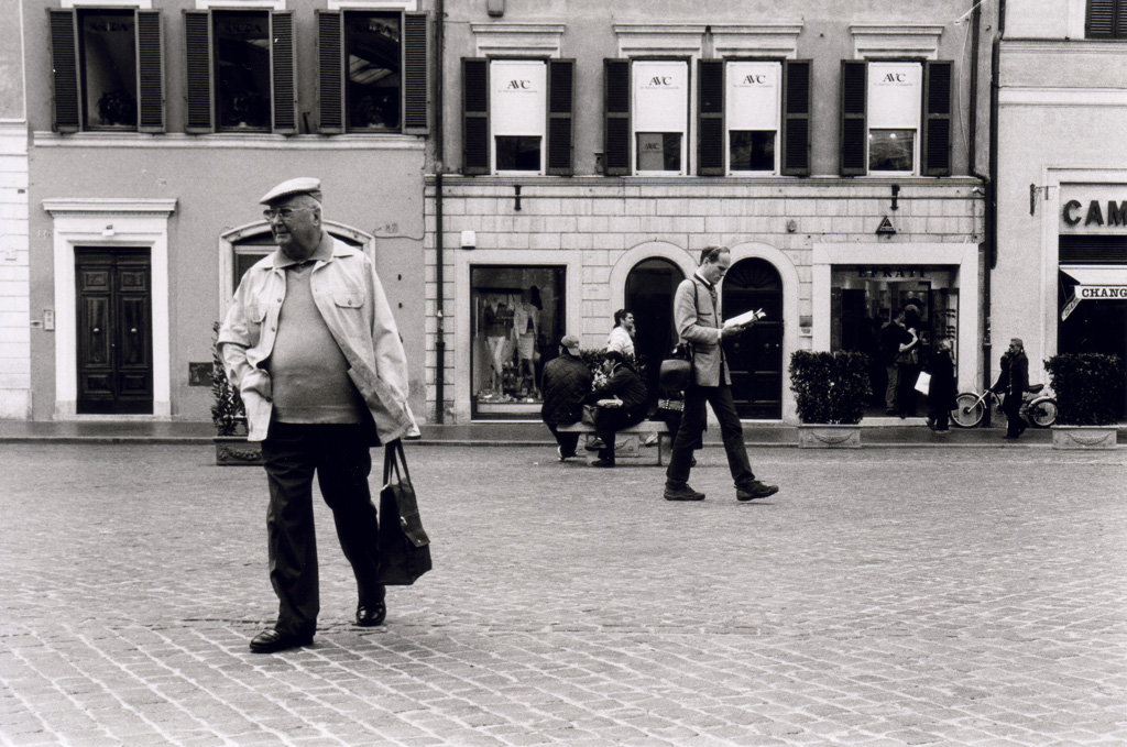 Per il fuoco non so' come fai tu ma ti dico come faccio io.....ma non va sempre bene ....nel caso di questo scatto e parlando di telemetro Leica, mi sembra una buona luce pertanto imposto il diaframma a f/8, o una tacca di meno, poi cerco una linea che dovro' mettere a fuoco sul soggetto, in questo caso la gamba dx sul pave' perche' c'e' contrasto, allineate le linee ......inquadro e scatto, nel caso sia in movimento il soggetto, la messa a fuoco sarebbe comunque buona visto l'f/8.....parlo di un 400 asa naturalmente  _________________ il mio sito