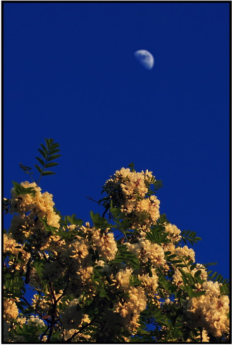 Grazie Giuseppe ...mi spiace se nel tuo monitor la vedi un pò spenta... è un peccato ...comunque la mia idea non era quella di rappresentare in modo naturalistico la luna....o l'acacia....che poi Silvrom c'ha rivelato essere una robinia