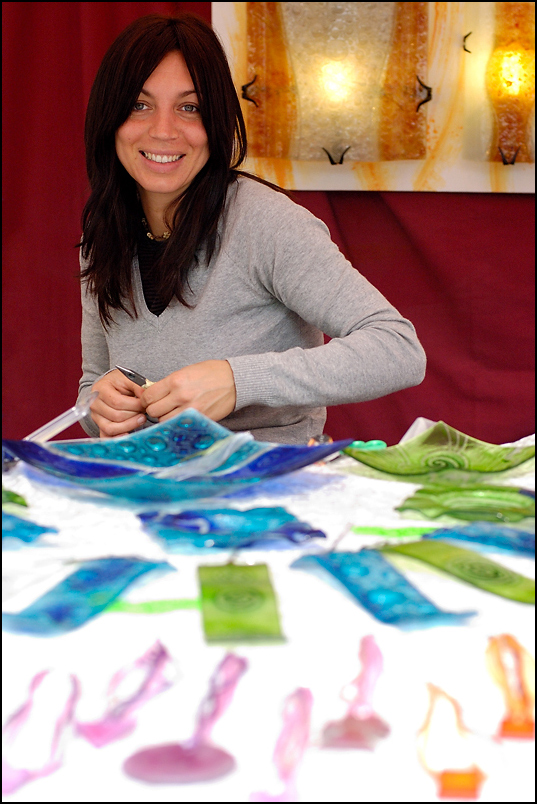 Stavo gironzolando tra i banchi di una fiera, ho notato questa ragazza che stava lavorando a degli oggetti in vetro, le ho chiesto se potevo scattarle qualche foto, mi ha risposto con questo sorriso.