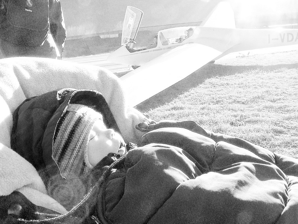 Che belli l'effetto del controluce, la grana e la scelta dell'inquadratura con l'aliante in secondo piano... E poi quella bambina che dorme pacifica con il suo nasino all'insù...
