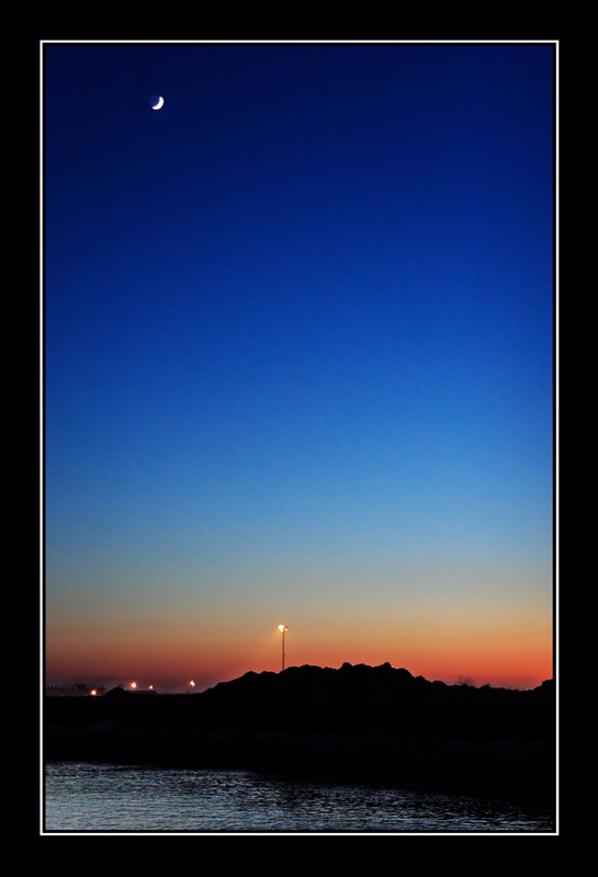 Condivido la scelta di spingere così in basso la silhoutte della riva con la sua lieve punteggiata di luci: il fotogramma acquista sostanza alla base e può reggere l'incredibile progressione cromatica del cielo con il suo vertiginoso digradare dall'arancio al blu cobalto.