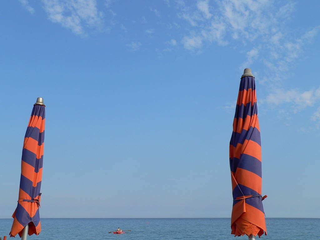 Un bel gioco cromatico per un'immagine gradevole. Bella la posizione dell'orizzonte e gli ombrelloni che svettano. Bello il mare pulito con l'unico centro di interesse dato dal moscone.