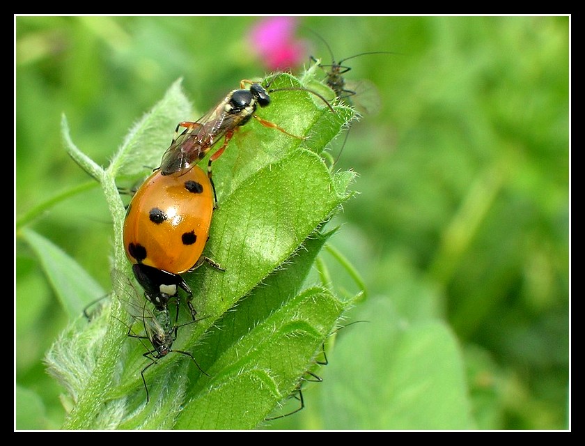 mentre la coccinella si sta mangiando vivo l'afide, la vespa in alto, molto probabilmente, sta cercando di deporre un uovo all'interno del corpo della coccinella. Da questo uovo nascerà una larva, che a sua volta divorerà lentamente gli organi vitali della coccinella, che morirà solo al momento in cui la larva della vespa sarà matura.