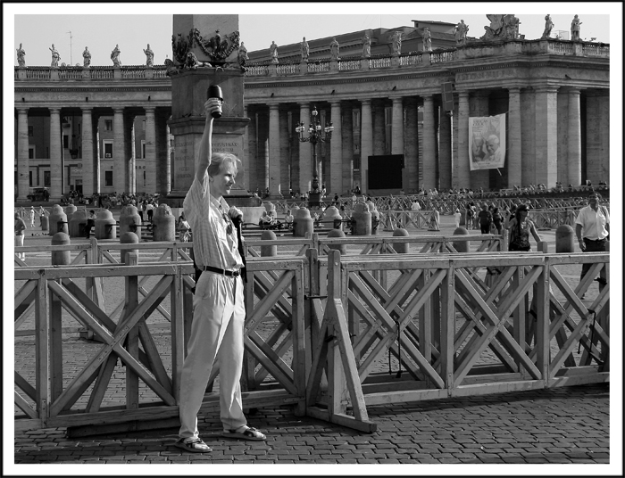 Sei stato bravo a catturare l'insolita situazione ed a piazzare il protagonista nel punto di massima visibilità in relazione allo sfondo (mi riferisco alla colonna alle spalle). Anche la composizione non è male. Al B&N, in senso assoluto, si poteva chiedere un maggiore stacco tra i vari piani spaziali (da realizzare con altrettanti livelli tonali).
