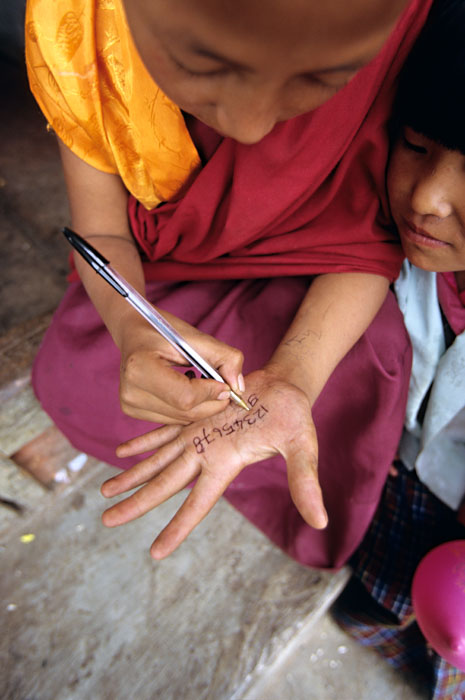 Un giovane monachello buddista si esercita nella scrittura sull'unico "supporto" a disposizione. Monastero di Bumthang, un remoto villaggio del Bhutan.