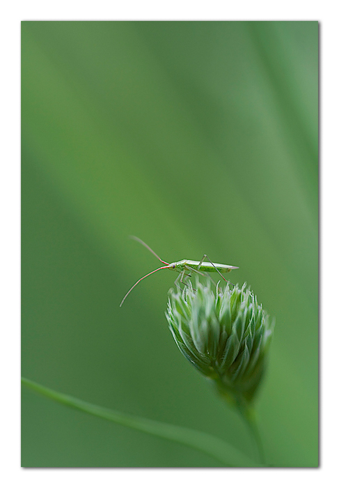 Composizione minimale ed essenziale. Il posatoio batuffoluto, il filo sfocato che da il senso di vertigine e di vuoto, e lui il piccolo antennuto che timido si affaccia. Il tutto illuminato da un raggio di luce che tinge il giusto filo d'erba di un verde appena più chiaro.