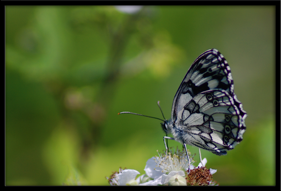 Di questo scatto mi piace molto la luce che, filtrata dalla vegetazione, ti ha regalato questo sfondo di chiari e di scuri, se poi avessi fatto un passo verso sx e avesi cercato li occhi sarebbe stato meglio, ma si sa che le farfalle sono dispettose!! I bianchi mi sembrano ben gestiti, ma avrei forse provato a prendere i fiorellini tutti interi, forse a livello di composizione avresti guadagnato un po' di slancio e leggerezza.