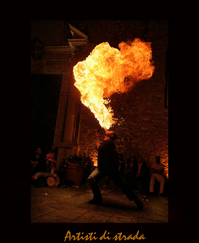 Bella...la fiammata è perfetta...nulla di dire (a proposito...come hai preso l'esposizione?)...ma l'artista secondo voi non è un po' scuro?...forse un colpetto di flash? (sono domande, non vuole essere una critica negativa)