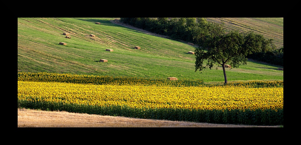 bellissimo il campo di girasoli a contrasto con il campo in secondo piano...