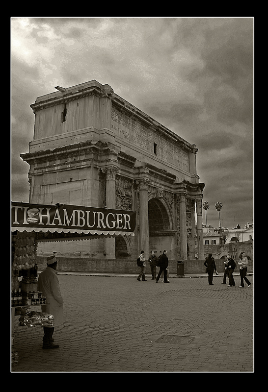 questa l'ho scattata ai fori imperiali, cuore dell'antica roma, quando ho visto quell'ambulante con la scritta "hamburger" mi e' venuto istintivo fotografarlo