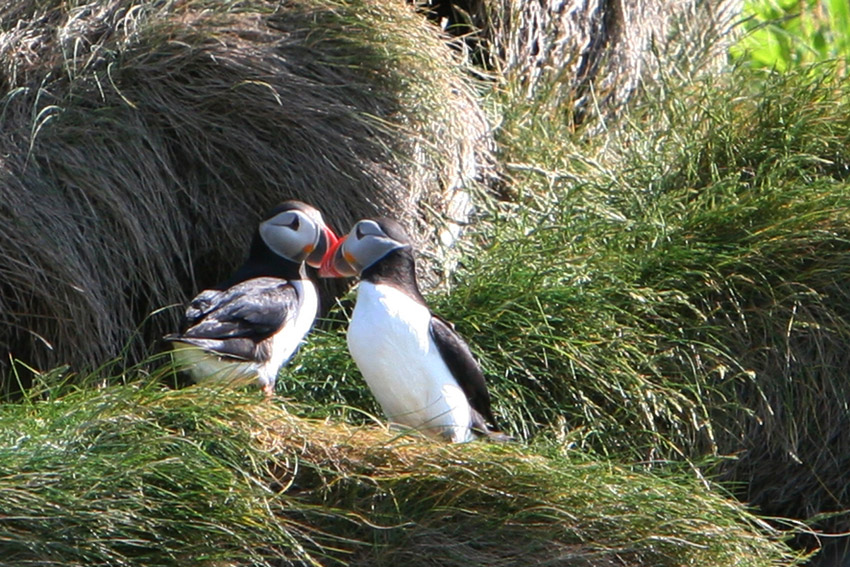 Fratercula arctica o più comunemente chiamato pulcinella di mare. Nidifica nella parte più alta delle scogliere. Il nome deriva dal piumaggio bianco e nero e dal buffo becco. Foto scattata dalla spiaggia vulcanica di Reynisfjara, a pochi km. da Vik.
