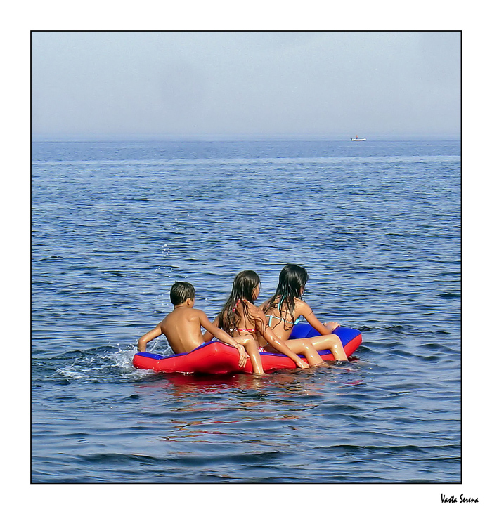 sono lì, che si divertono, con quel materassino, il ragazzo che chiude il terzetto gioca a schizzare con l'acqua..