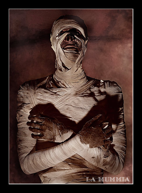 Vecchio film in bianco e nero con Boris Karloff. La pelle è prodotta con una mistura di miele, cerone marrone scuro e farina. Piccoli pezzi di carta da tovagliolo immersi in acqua e caffè e fatti poi essiccare. Con un pennello intinto nella mistura marrone si attaccano i pezzetti di carta sul viso e sulle mani. Le bende sono normali garze lasciate a invecchiare nel caffè e the, mescolati in una tinozza