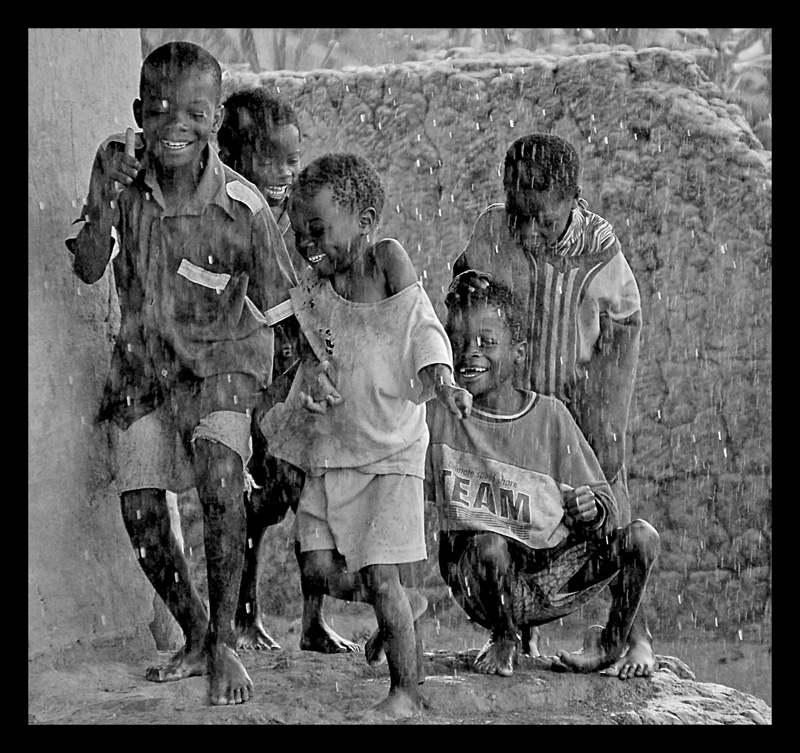 Un'altra immagine scattata nella Guinea forestale al tempo della pioggia che cade violenta con scrosci inprovvisi. In questo periodo, tutti i giorni almeno due-tre volte. I bambini giocano e si divertono molto a vedere gli uomini europei(come me) che tentano di ripararsi inutilmente.